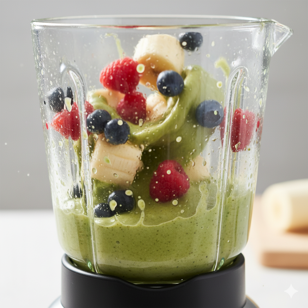 - 바나나, 베리류를 채소와 함께 갈아 그린 스무디 만들기