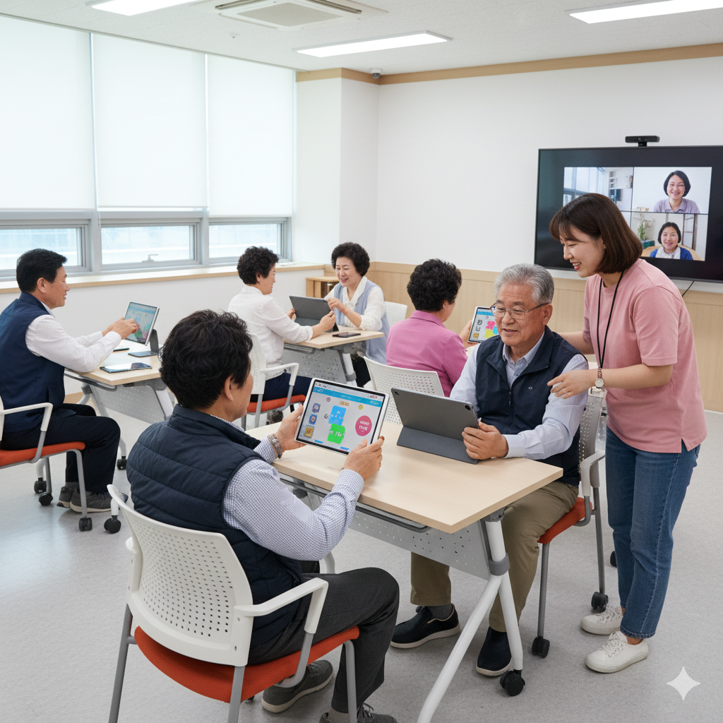 - 활동 내용: 스마트폰/태블릿 기본 활용(메신저, 사진 찍기), 디지털 게임(두뇌 트레이닝 앱), 키오스크 사용법 교육, 인터넷 정보 검색, 온라인 커뮤니티 활동, VR/AR을 활용한 가상 체험 인지 훈련.