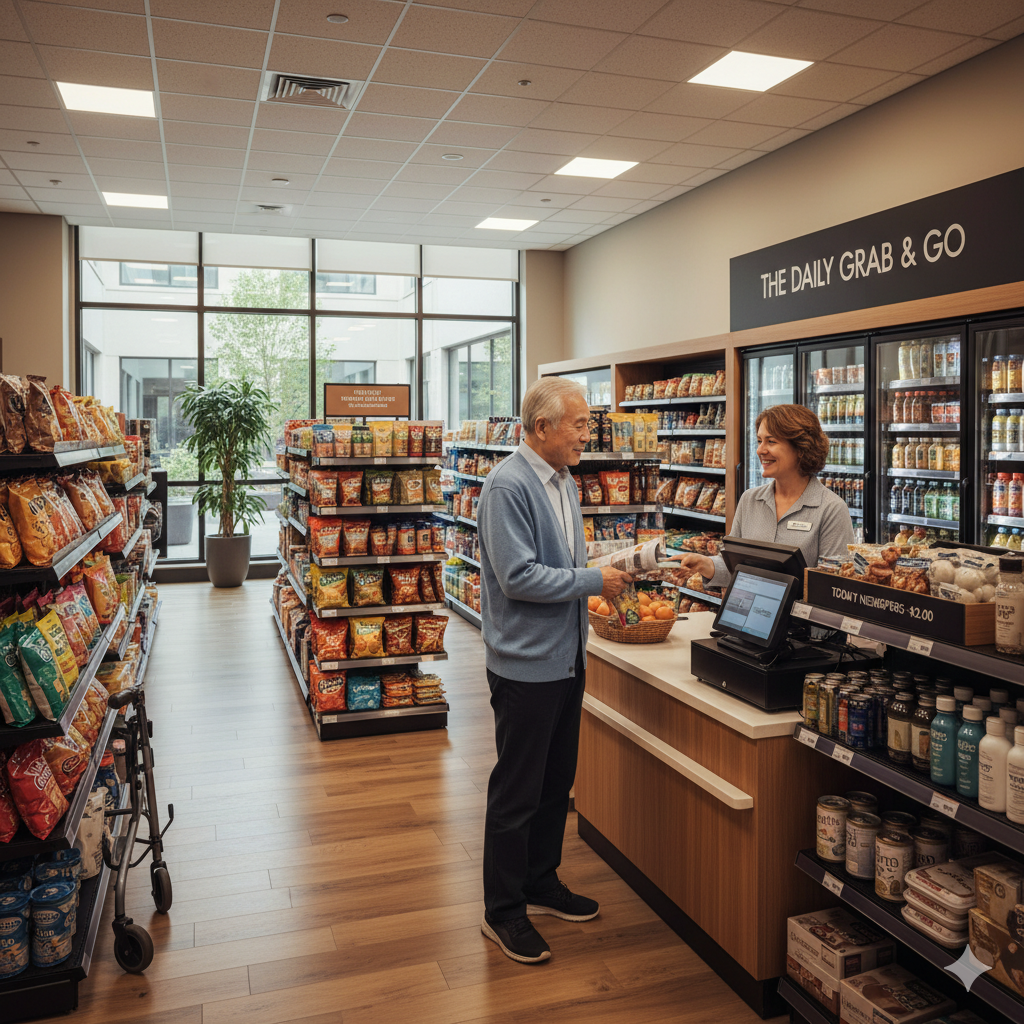 • 문제: 단지 내에 매점이나 편의 시설이 없다면, 기본적인 생필품(간식, 음료, 세제, 일회용품 등)을 사기 위해 매번 실버타운 교통 수단을 이용해 외부로 나가야 합니다. 특히 거동이 불편하거나 날씨가 좋지 않은 날에는 큰 불편함이 됩니다.