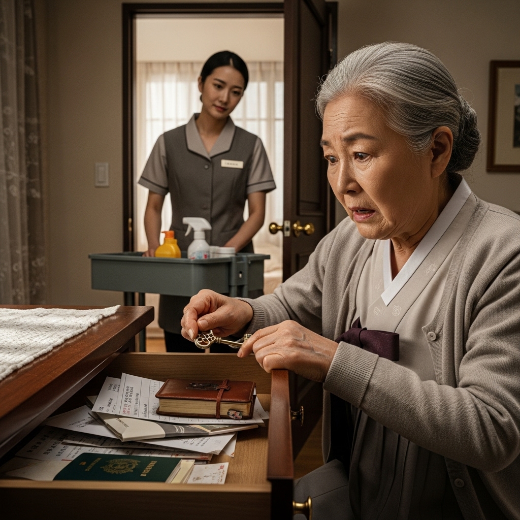 김 할아버지: (자신의 바지 주머니에서 쭈글쭈글한 메모지를 꺼내며) 아이고, 박 여사. 저는 더 기가 막힙니다. 청소 서비스 직원이 청소는 대충 해놓고, 제 비상금 넣어둔 서랍을 열어본 것 같아요! 제 비상금 위치가 0.5센티 옆으로 틀어져 있었다니까요!
