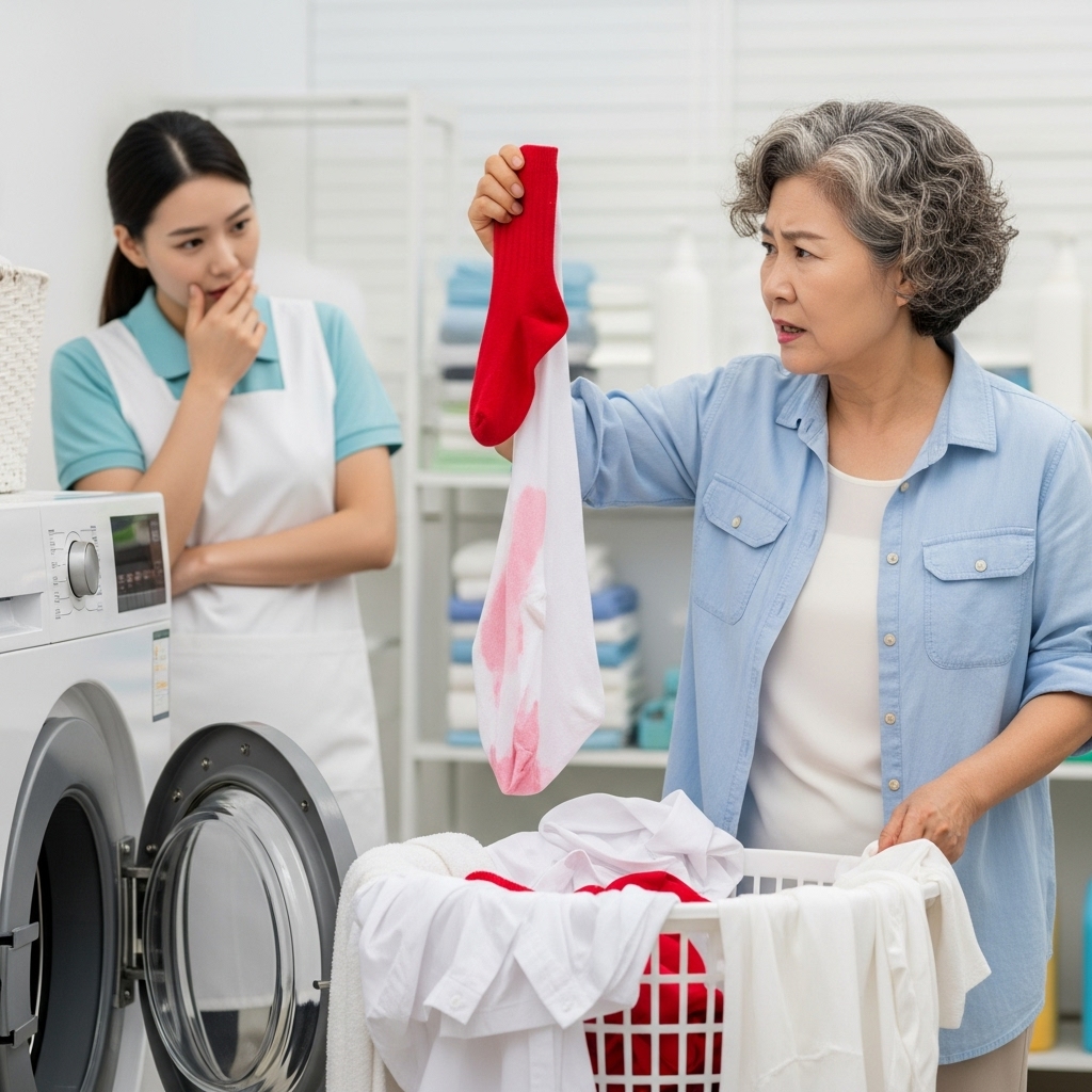 박 할머니: (자기 세탁물 바구니를 뒤적이며) 김 선생! 어제 제 하우스키핑 서비스 받는 날이었는데, 내 흰 블라우스가 분홍색이 되어 돌아왔어요! 빨래할 때 빨간 속옷이랑 섞은 게 분명해요!