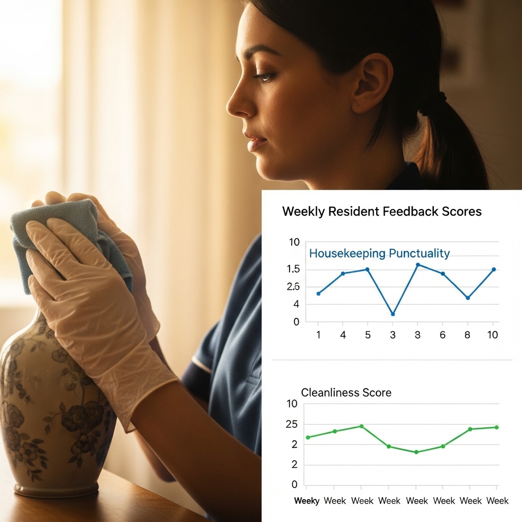 - 만족의 기준: 직원은 반드시 노크 후 입주민의 허락을 받고 출입하며, 입주민이 청소/세탁 거부 의사를 밝혔을 때 이를 존중하는 출입 통제 시스템이 엄격하게 지켜지는지 점검해야 합니다.