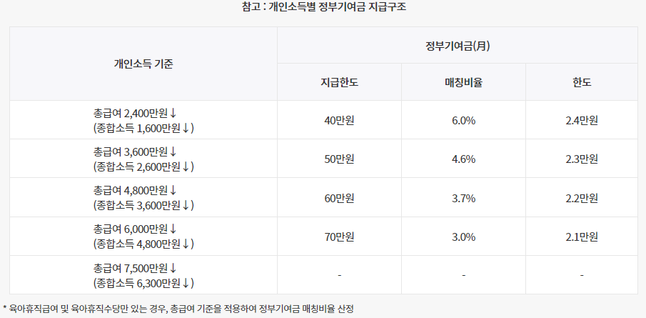 - 납입한 금액에 비례해 소득구간별 정부기여금 지원